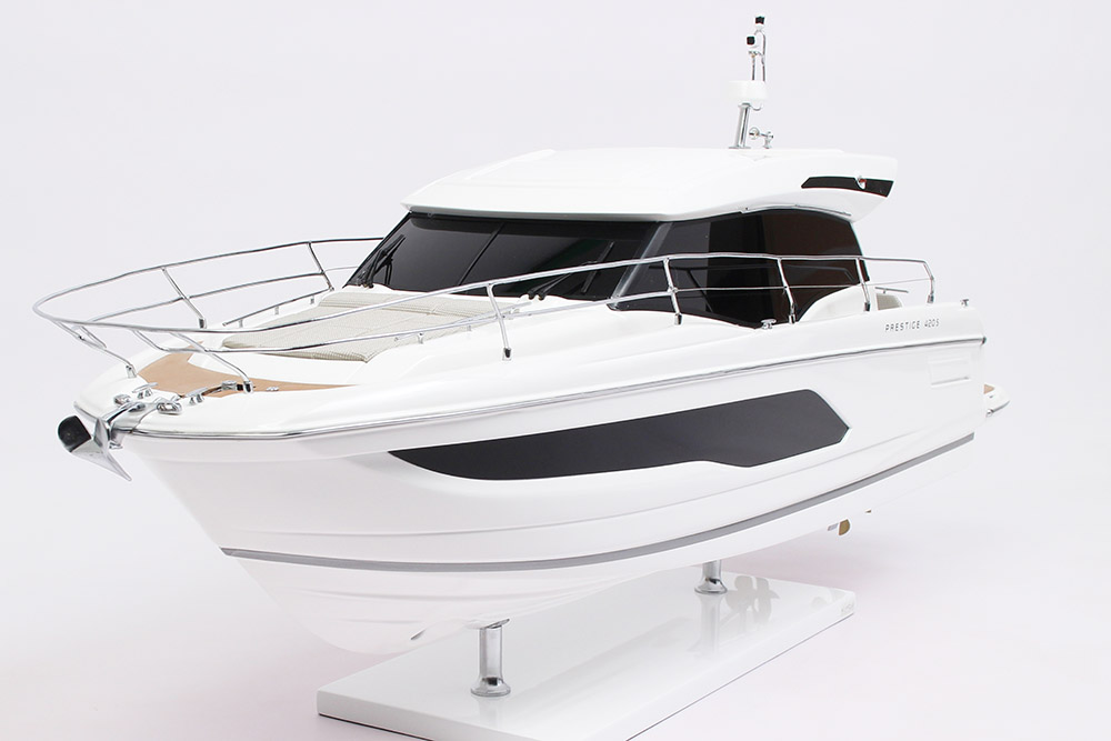 Fidèle réplique du Prestige 420S (Nouvelle version). Cette maquette officielle à l’échelle 1/20ème est réalisée en partenariat avec le chantier Jeanneau d’après les plans d’origine.