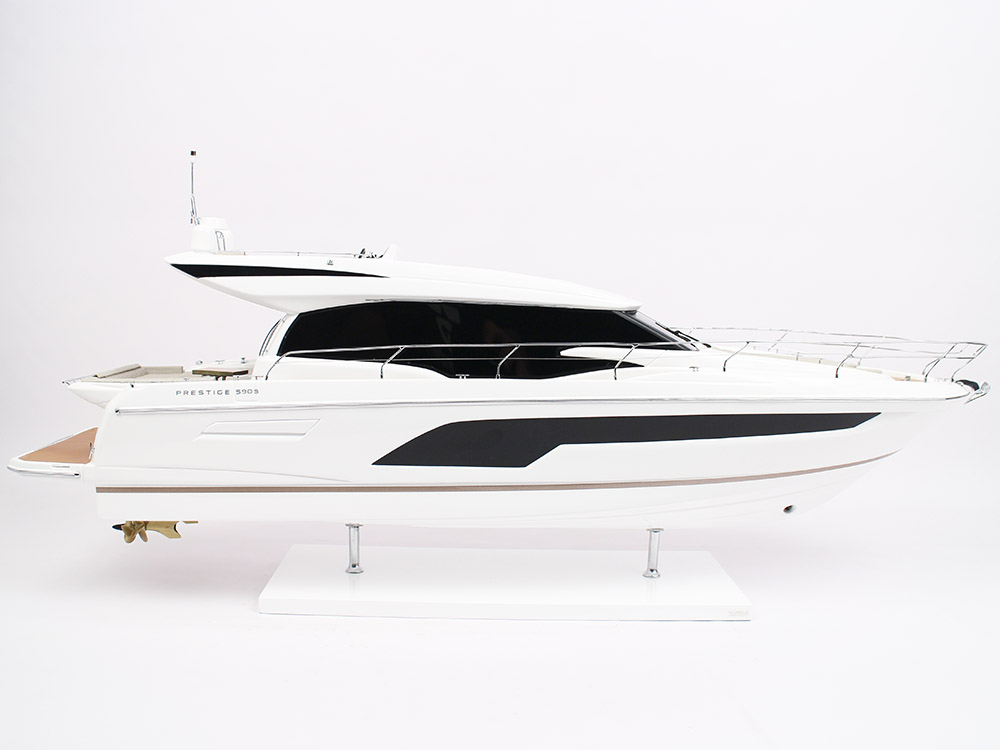 Fidèle réplique de la Prestige 590 S. Cette maquette officielle à l’échelle 1/20ème est réalisée en partenariat avec le chantier Prestige-Yacht d’après les plans d’origine.
